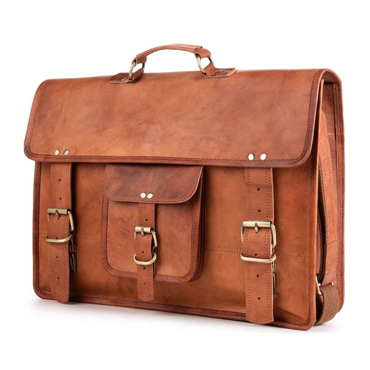 Its smart design includes a padded laptop compartment, two interior zippered pockets, and a rear anti-theft zipper pocket for secure storage. The flap closure features hidden snap buttons under traditional buckles, blending vintage aesthetics with everyday convenience.